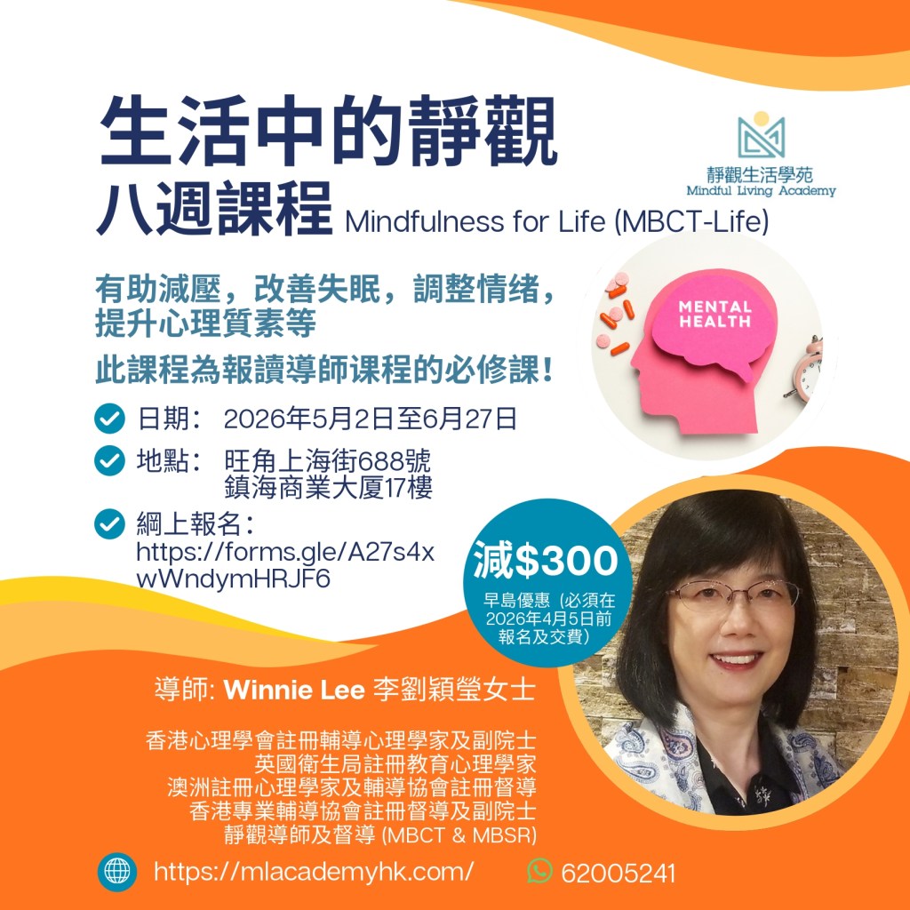 「靜觀認知治療 – 生活」 2026年5至6月 – 八星期課程 報名 參加「靜觀認知治療 -生活」八星期課程 「靜觀認知治療」畢業生 分享此文: 分享到 X(在新視窗中開啟) X 分享到 Facebook(在新視窗中開啟) Facebook 喜歡 正在載入...